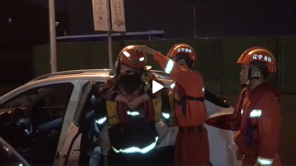 10月1日凌晨,辽宁大连,突发强对流降雨天气并伴有短时冰雹。市消防员赶赴后将积水中被困人员有序转移,并将被困车辆推至安全地带。