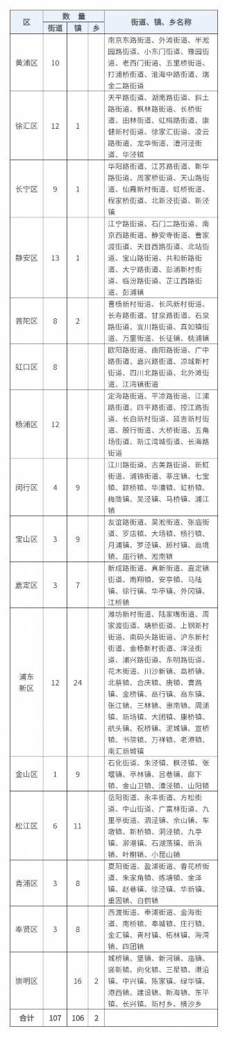 你知道上海现在有多少街道多少乡镇吗?市民政局介绍,截至2022年12月31日,上海16个区共有107个街道、106个镇、2个乡。所有街道、镇、乡名称详见↓