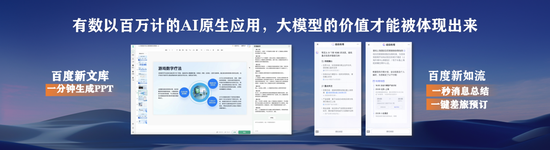 未来人工智能发展将由基础大模型引领,一定要在大模型的基础上去做AI原生应用,要有数以百万计的AI原生应用,大模型的价值才能被体现出来。比如百度文库,就是基于文心大模型重构的原生应用,能够一分钟生成20几页的PPT,这种AI能力让更多的人在积极使用百度文库。再比如百度的如流,能快速识别海量未读消息,节省90%以上的消息阅读时间,现在,如流超级助理有超400个插件,每天为用户提供数十万次服务。这样,AI原生应用就对企业产生了巨大价值。