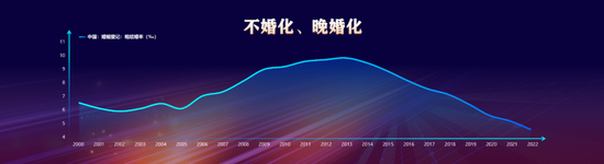 再来看看不婚化、晚婚化现象。2013年,我国结婚登记对数为1347万对,2022年结婚登记对数下降到683万对,已经连续九年下降。我国的结婚率从2013年的9.9‰开始逐年下降,2022年结婚率下降到4.8‰。现在年轻人不仅不生了,甚至连婚都不想结了。
