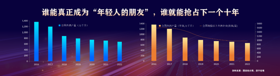 Z世代全新的消费特点,对传统消费品带来了全新的挑战和机遇,传统品牌的年轻化迫在眉睫。以白酒行业为例,全国白酒产量已经连续七年下跌,2022年中国白酒累计产量几乎是2016年的一半。但与之对应的是,年轻群体正在快速成长为酒水市场主力军。