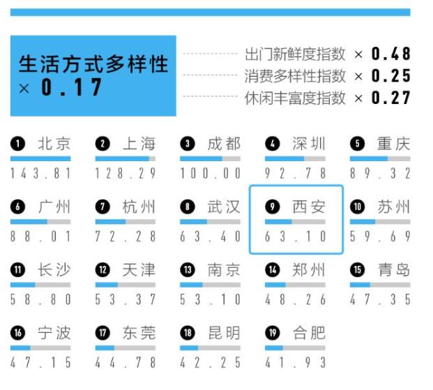 生活方式多样性主要测量出门新鲜度、消费多样性和休闲丰富度。近年来,西安加快培育“三都四城”城市品牌。加快建设彰显中华文明的“历史文化之都”,引领潮流风尚的“时尚购物之都”,传古承今的“国际美食之都”,逐步建成面向“一带一路”的“国际旅游名城”“国际教育名城”“国际会展名城”和“世界赛事名城”,市民生活的方式也随之更加丰富和多样化。