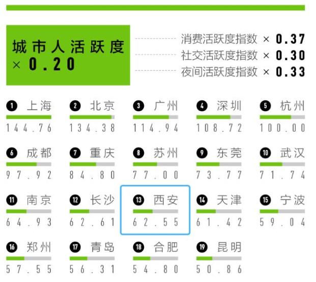 城市人活跃度指数,衡量消费、社交和夜间三个维度的活跃情况。近年来,西安围绕造节造景、文化破圈、首店经济、活力夜经济等方面,重塑着全新的消费场景,在不断满足人民群众日益增长的美好生活需求同时,推动着城市高质量发展。