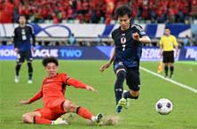 在19日进行的2026美加墨世界杯亚洲区预选赛18强赛第六轮比赛中,于厦门主场作战的中国队由林良铭打入一球,但最终仍1:3不敌日本队。11月19日,日本队球员小川航基(左)头球攻入本场个人第二粒进球。