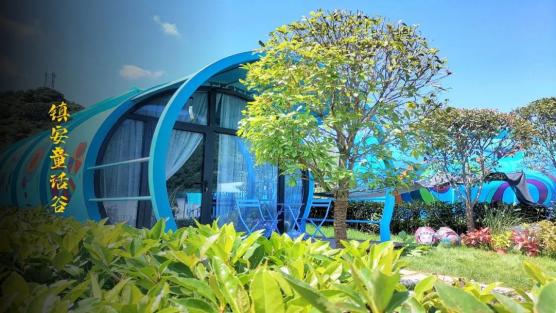 童话磨石沟童话谷创意民宿,在一路的微风低语与潺潺的流水声中,顺着大路,信步而行,郁郁葱葱的山林里。隐约闪现的两栋白色建筑一侧的是“艺舍”,与之遥遥相对的“雲舍”,在两舍之间以拱形姿态分布在山腰之上,便是引人注目的罐罐屋,五色斑斓。