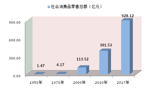 2017年,全市社会消费品零售总额928.12亿元,是1958年的632.1倍,年均增长11.6%,是1978年的222.8倍,年均增长14.9%。