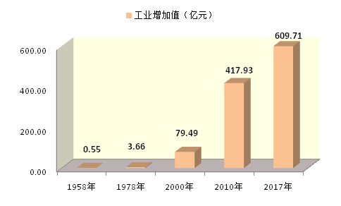 2017年,全市工业总产值2094.56亿元,是1958年的1233.8倍,年均增长13.1%,其中1979-2017年年均增长14.3%;全市工业增加值609.71亿元,是1958年的1101.4倍,年均增长12.3%,其中1979-2017年年均增长12.8%。