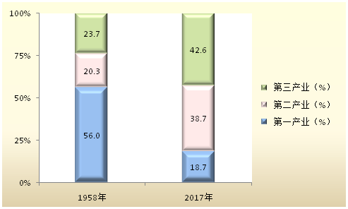 经过60年来的不断发展,尤其是改革开放以来的快速发展,全市产业结构经历了由第一产业为主的传统模式,向第二、三产业为主,三大产业协同融合发展的方向突破。三次产业结构由1958年的56.0:20.3:23.7,调整到1978年的43.4:35.3:21.3, 2017年,三次产业结构为18.7:38.7:42.6。1999年完成了产业结构的第一次质变,第三产业占比超过了第一产业;2002年完成了产业结构的第二次质变,第二产业占比超过了第一产业。2017年第三产业占比重新超过第二产业,对经济增长的贡献率达85.0%。
