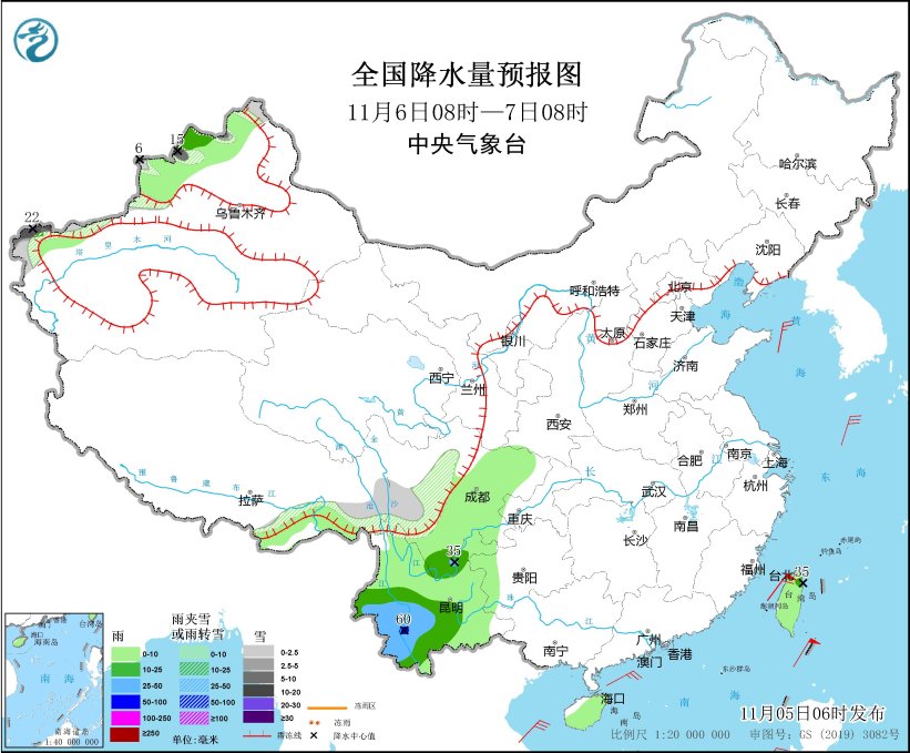 11月6日08时至7日08时,新疆北疆北部和南疆西部山区、西藏东南部、川西高原等地部分地区有小到中雪或雨夹雪,其中,新疆北疆北部和南疆西部山区等地高海拔地区有大到暴雪,局地大暴雪(20~22毫米)。云南中南部、四川南部、台湾岛东北部等地部分地区有中到大雨,其中,云南西南部等地部分地区有暴雨(50~60毫米)(见图2)。