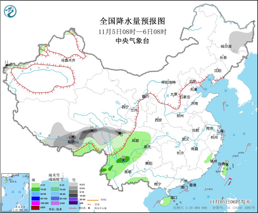 11月5日08时至6日08时,黑龙江东部、新疆北疆北部和南疆西部山区、西藏中部和东部、川西高原等地部分地区有小雪或雨夹雪,其中,西藏中部和东部、川西高原等地部分地区有中到大雪,西藏中东部、川西高原中东部等地局地暴雪(10~16毫米)。西藏东南部、云南中北部、四川中部和南部、重庆西部、海南岛、台湾岛大部等地部分地区有小到中雨,其中,四川南部、台湾岛东北部等地部分地区有大雨(25~45毫米)。台湾海峡、巴士海峡的风力可达8级、阵风9级,其中台湾海峡部分海域风力可达9级、阵风10级(见图1)。