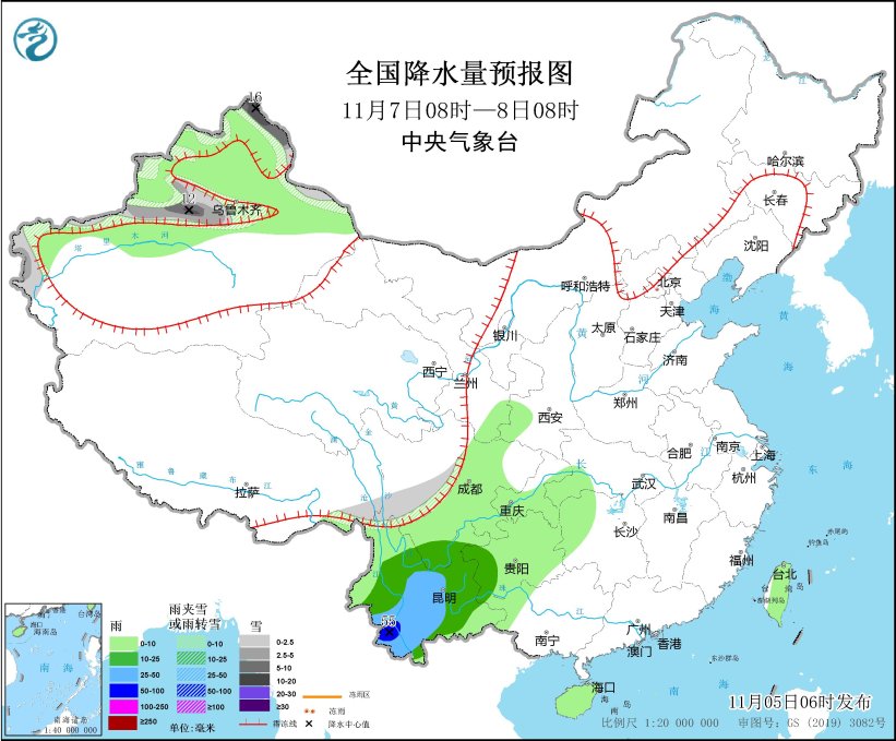 11月7日08时至8日08时,新疆西北部山区、南疆西部山区、西藏东部、川西高原等地部分地区有小雪或雨夹雪,其中,新疆北疆北部和沿天山地区等地部分地区有中到大雪,局地暴雪(10~16毫米)。云南大部、西川南部、贵州西部等地部分地区有中到大雨,其中,云南西南部部分地区有暴雨(50~55毫米)(见图3)。