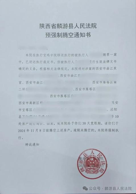 为了进一步彰显司法权威,践行善意文明执行理念,近日,麟游法院发出首份《预强制腾空通知书》,通过预通知措施,体现执行工作的“力度”和“温度”。