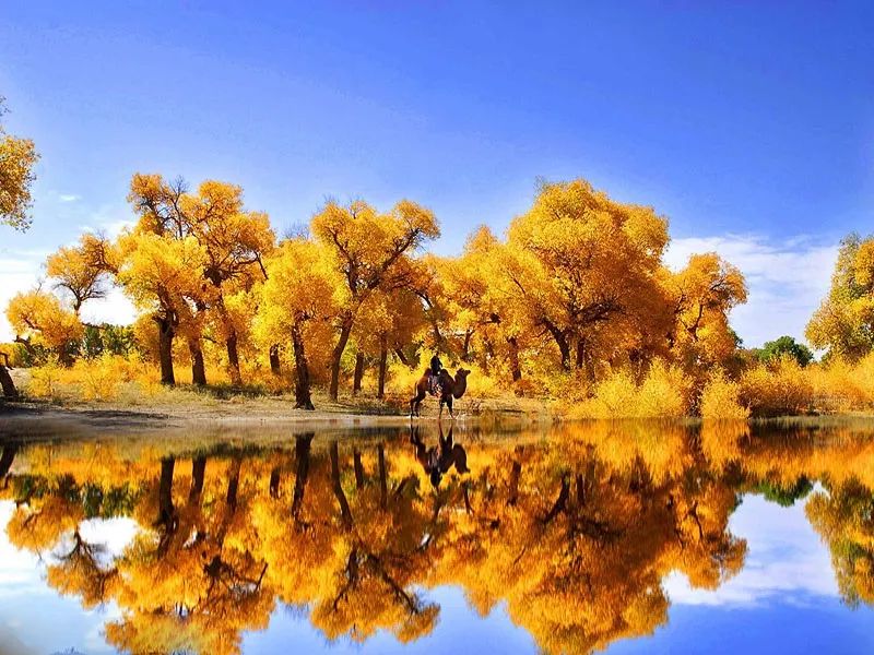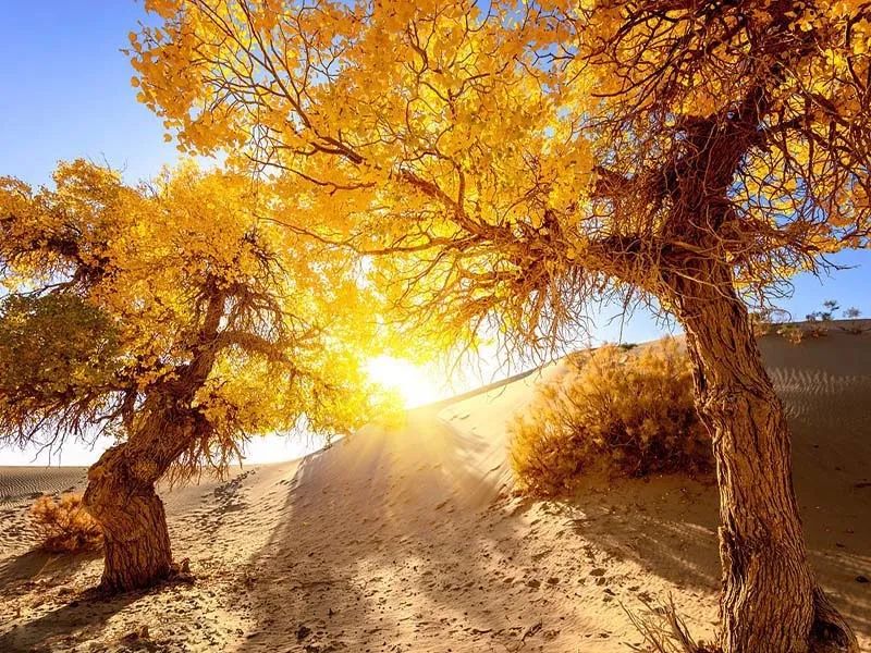 当大漠旷野吹过一丝清凉的秋风时,胡杨林便在不知不觉中,由浓绿变为浅黄,继而变成杏黄了。
