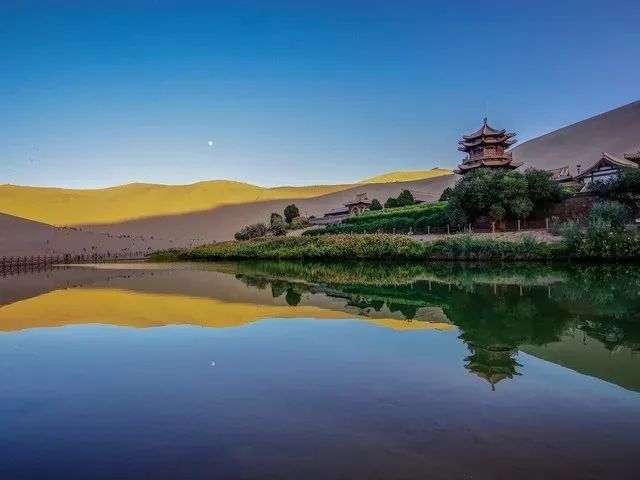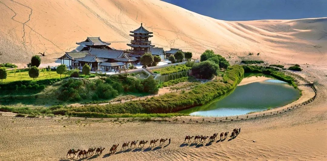 月牙泉被鸣沙山环抱,因水面酷似一弯新月而得名。