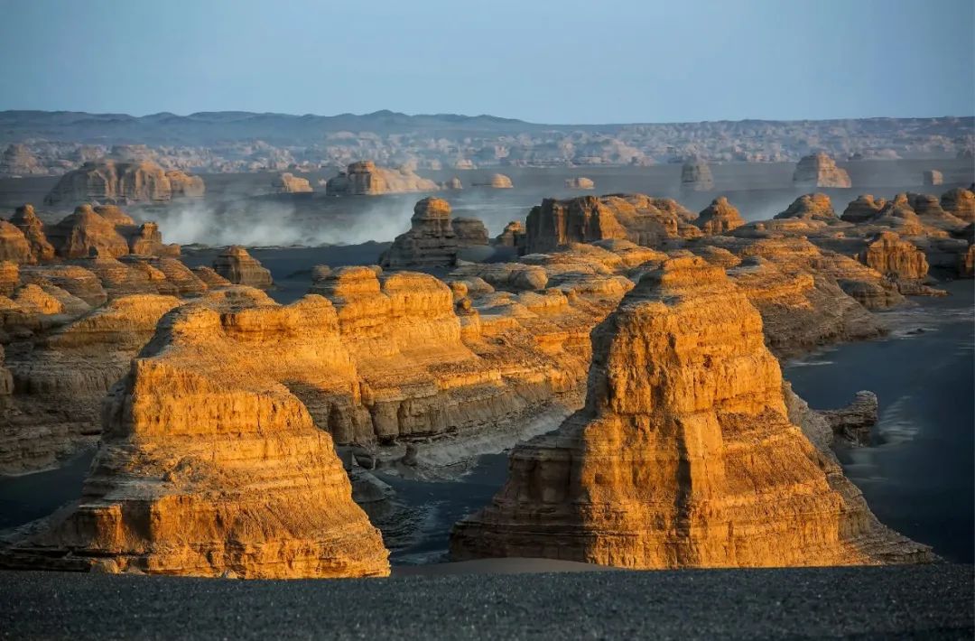 黄昏时分,或许是魔鬼城最温柔的时刻,被金色覆盖着的黄色土丘,似乎掩饰了它的苍凉和阴森,显得有些柔软和温暖。