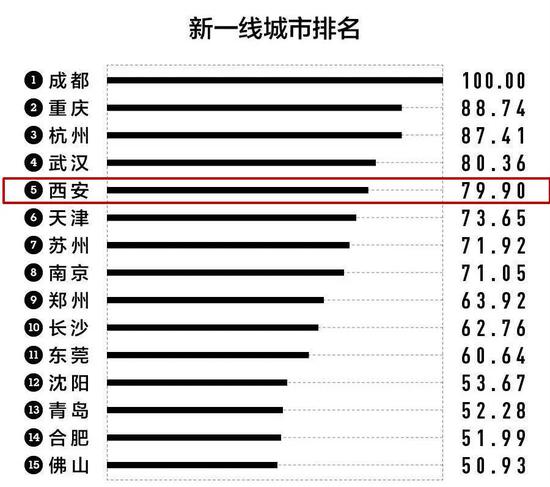 西安首次进入新一线城市头部梯队,排名第五。