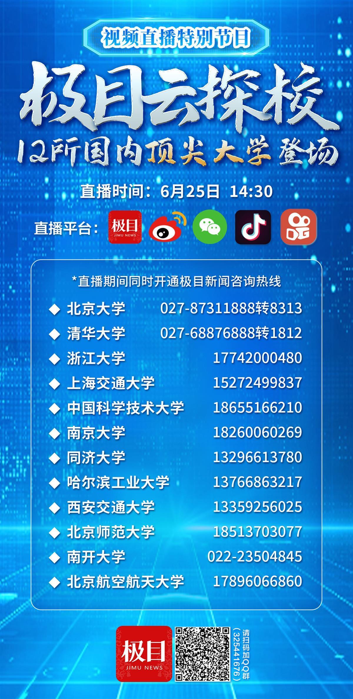 为更好地服务考生和家长,6月25日下午2时30分至5时,楚天都市报极目新闻将邀请全国80多所高校接听高考招生咨询热线,指导考生填志愿。