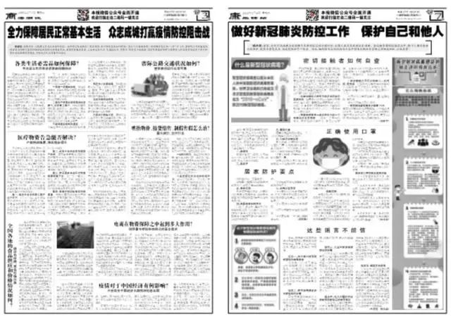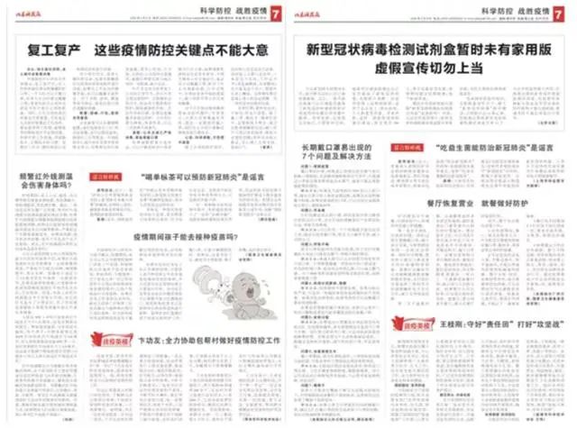 刊发防控新冠疫情科普专版。分别从“自我防控新型肺炎 保护自己和他人”“疫情当前,我们应该这样做”“众志成城打赢疫情防御防控狙击战”等方面开展新冠肺炎防控知识的宣传科普,做好疫情防控的宣传教育。