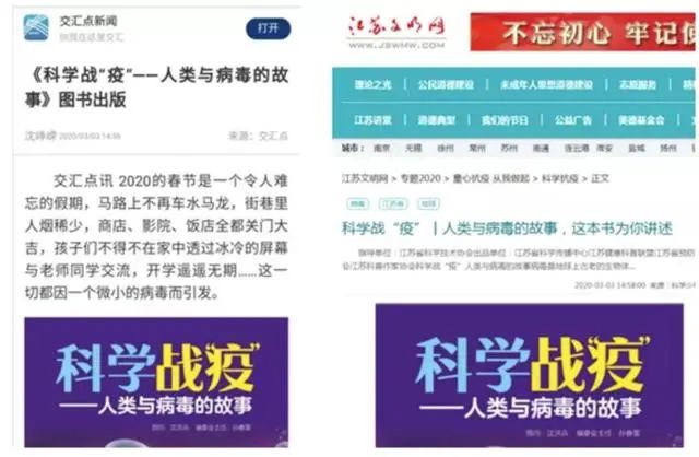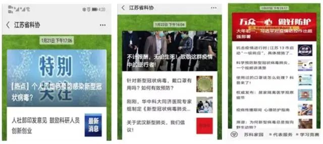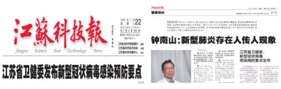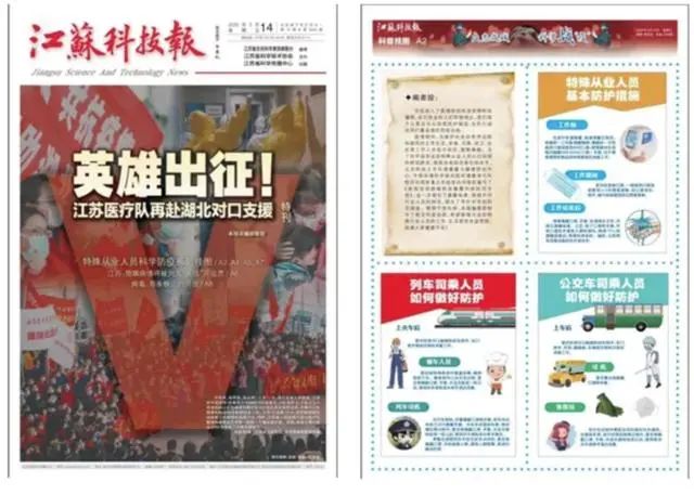 1月22日,江苏科技报较早报道了“钟南山:新型肺炎存在人传人现象”的相关内容,同时发布了省卫健委新冠肺炎感染预防要点。随着疫情防控形势的日益严峻,编辑部集中力量,连续组织出版8期科学战疫特刊,除了疫情防控的相关知识和要求外,大力宣传抗疫中的“江苏身影”,推出《连线武汉》《“战地”日记》《驰援湖北,他们是最美“逆行者”》等栏目和报道,宣传江苏医卫战线援鄂先进典型和感人事迹。并围绕疫情防控科普、特殊岗位人群防控措施、中小学开学后校园防控、野生动物保护等先后出版5期挂图版报纸,定点向全省有关单位配送,其中特殊岗位防控挂图内容被中国科协采用。