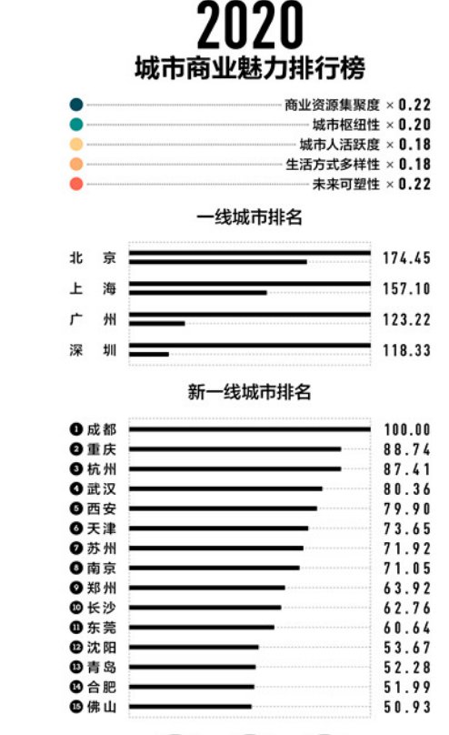 2020年,15个进入“新一线”的城市依次是:成都、重庆、杭州、武汉、西安、天津、苏州、南京、郑州、长沙、东莞、沈阳、青岛、合肥、佛山。
