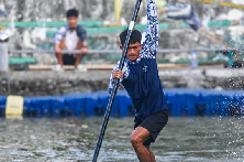 11月的海南三亚,一群年轻人在三亚河面上手握长杆、脚踩竹竿,奋力划向上游的终点,他们就是独竹漂项目的运动员。11月28日,在海南三亚举行的第十二届全国少数民族传统体育运动会独竹漂项目全部小项的比赛结束后,广西队独竹漂选手陆春桃为教练蓝建卓(右)戴上奖牌。