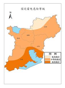 雷电灾害致灾因子危险性主要考虑电闪频率、雷暴日数、闪电日数和雷电灾情记录。以上四个因子设定权重分别为0.5、0.1、0.1和0.3,经计算得到雷电灾害危险性等级。如图6所示,泗洪南部和泗阳南部为雷电高危险区,沭阳西北部为低危险区,其它地区雷电危险等级中等。
