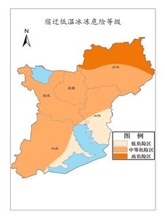 低温冻害致灾因子危险性主要考虑低温日数、极端最低气温和结冰日数。将以上三个影响因子权重系数分别设为0.3、0.4和0.3,经计算得到低温冻害危险性等级。如图7所示,沭阳东北部地区低温冰冻的危险等级高,泗阳和泗洪东南部为低危险区,其它地区危险等级中等。