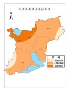 高温致灾因子危险性主要考虑高温日数和极端最高气温。将两个影响因子分别通过权重系数为0.5和0.5计算得到高温致灾危险性等级。如图5所示,泗洪、宿城西部地区为高温高危险区,沭阳东部为低危险区,其它地区均为中等危险区。