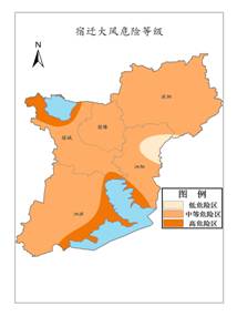 大风致灾因子危险性主要考虑极大风速、最大风速、平均风速和大风灾情记录。通过分析,将以上四个致灾因子权重系数分别定为0.2、0.2、0.3、0.2,计算得到大风灾害危险性等级。如图3所示,全市骆马湖和洪泽湖周边乡镇大风危险等级较高,其它地区危险等级中等。