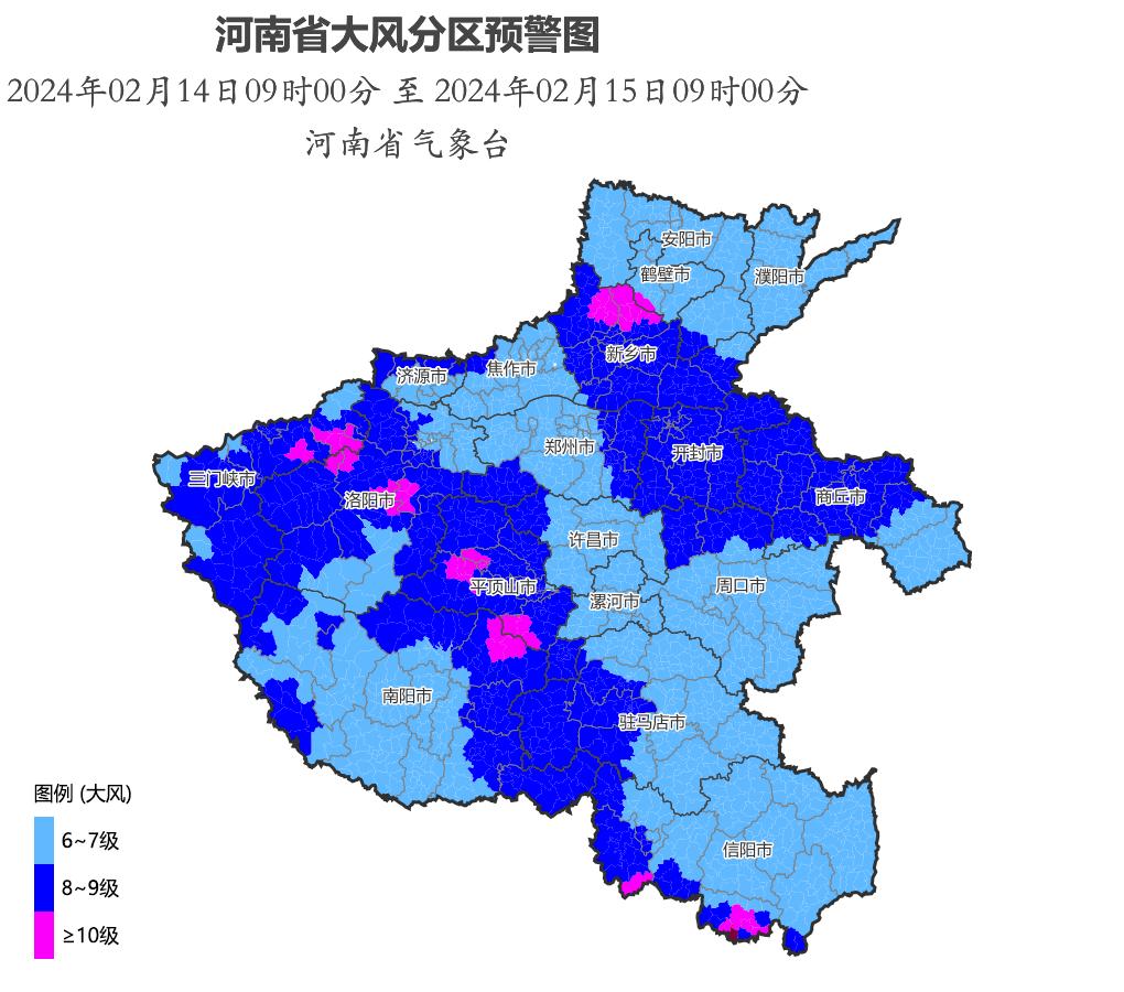开封市气象台2024年2月14日11时1分发布大风蓝色预警信号:预计未来24小时,龙亭区、顺河回族区、鼓楼区、禹王台区、城乡一体化示范区、祥符区等全部乡镇和街道将出现5-6级偏北风,阵风7-8级。14日下午到夜里全市有小雨或零星小雨;15日全市大部最高气温较前期下降8-10℃,15日最高气温10℃,16日凌晨最低气温1℃左右。