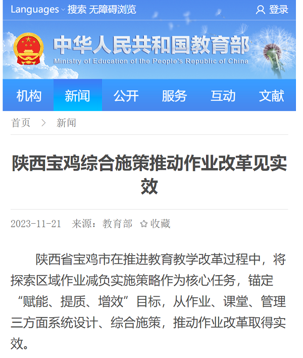 2023年11月21日,教育部官网手机客户端以《陕西宝鸡综合施策推动作业改革见实效》为题,面向全国推介宝鸡中小学作业改革经验。2023年10月13日,《陕西省“双减”工作动态》(第47期)也以《宝鸡市唱好减负提质“三重唱”》为题,面向全省推广宝鸡中小学改革经验。这是对宝鸡市借力国家基础教育优秀教学成果推广应用实验区,连续三年实施“作业革命”的充分肯定。教育部网站推介经验全文如下: