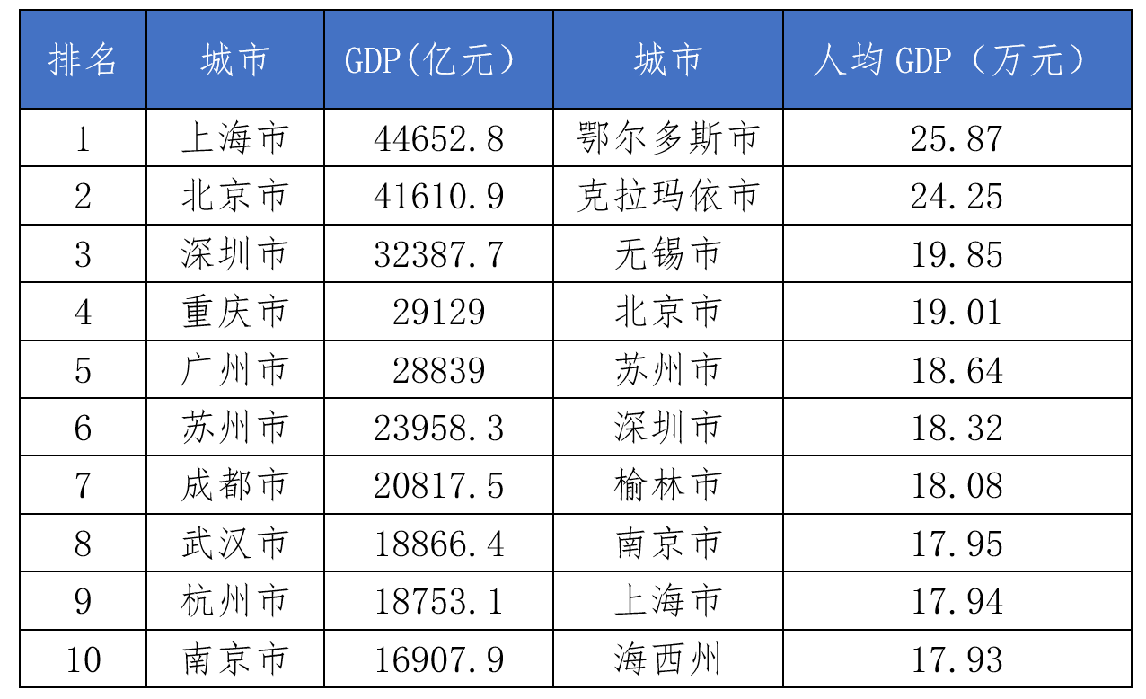 看到这个问题,相信很多人的答案都是,不一定。从中美城市GDP和人均GDP的前10位城市来看,确实是“不一定”。比如国内GDP最高的城市是上海,而内地人均GDP最高的城市却是鄂尔多斯,2022年其人均GDP高达25.87万元,是上海(17.99万元)的1.4倍左右。此外,克拉玛依、榆林和海西等城市在地区生产总值的规模上并不占优势,而由于是资源型城市,资源交易规模大,所以人均GDP能够进入全国前10。而北京、上海、深圳、苏州和南京五座城市不仅GDP总量高,人均GDP总量也高。