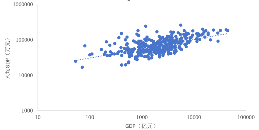 抛开前10位城市的典型性,如果从更加一般意义上去看,城市的经济总量高与人均经济量高之间还是有相当程度的关联性。比如以中国内陆的337个城市(地级行政区和直辖市)为例,2022年这些城市的GDP与人均GDP两者之间具有明显的非线性相关性(图1),其相关性可以达到0.37。这也不难理解,在标度律相关的专栏中,笔者曾经介绍过GDP作为经济社会指标具有显著人口超线性关系,即1+1>2的效应,假设1个人单独从事生产活动会产生1万元的GDP,2个人合作生产就会产生超过2万元的GDP,人口规模越大,人与人之间的互动往往成倍上升。由此,大城市中一个人产生的GDP边际效应就会明显提高。因此,经济总量高的大城市还是有相当的可能性人均经济总量也会高。