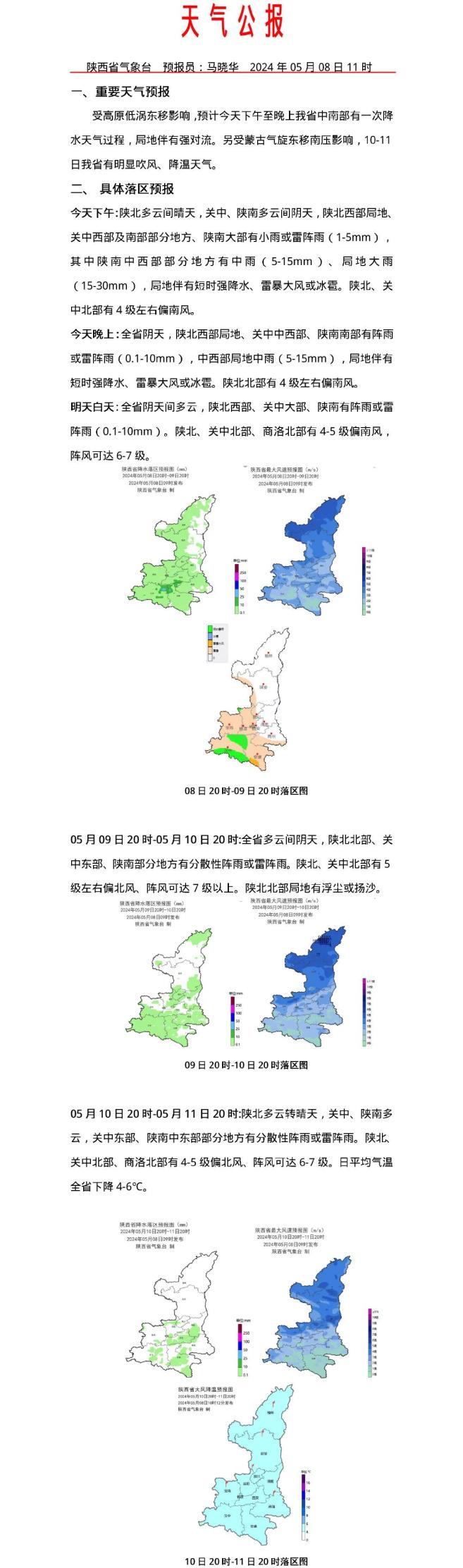 受高原低涡东移影响,预计今天下午至晚上我省中南部有一次降水天气过程,局地伴有强对流。另受蒙古气旋东移南压影响,10-11日我省有明显吹风、降温天气。