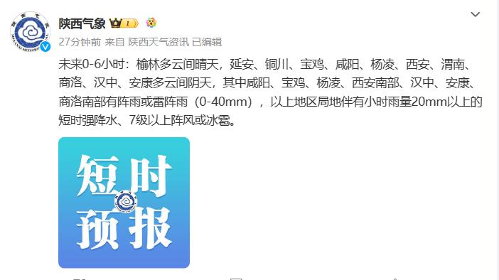 未来0-6小时:榆林多云间晴天,延安、铜川、宝鸡、咸阳、杨凌、西安、渭南、商洛、汉中、安康多云间阴天,其中咸阳、宝鸡、杨凌、西安南部、汉中、安康、商洛南部有阵雨或雷阵雨(0-40mm),以上地区局地伴有小时雨量20mm以上的短时强降水、7级以上阵风或冰雹。
