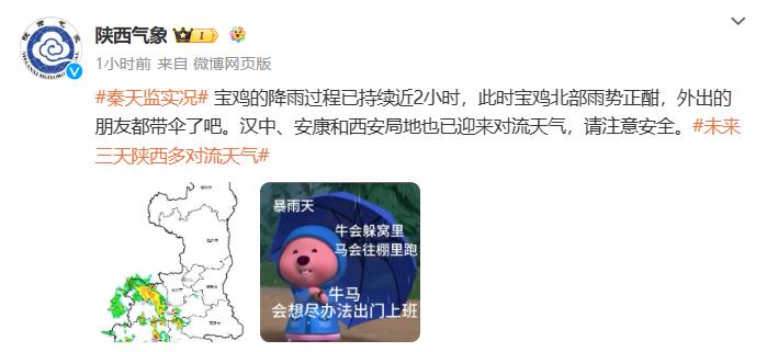 未来6小时内下述地区可能受雷雨大风影响,阵风可达7级或以上并伴有雷电,局地有短时暴雨和冰雹,最大小时雨量可达20毫米以上:西安市雁塔区、长安区、鄠邑区、周至县、西咸新区,宝鸡市渭滨区、金台区、陈仓区、扶风县、眉县、岐山县、凤翔区、太白县、麟游县、千阳县、陇县、凤县,咸阳市秦都区、渭城区、兴平市、武功县、三原县、泾阳县、礼泉县、乾县、永寿县、彬州市、淳化县、旬邑县、长武县,铜川市耀州区,延安市黄陵县、富县,汉中市汉台区、南郑区、城固县、洋县、勉县、西乡县、略阳县、镇巴县、宁强县、留坝县、佛坪县,安康市汉滨区、汉阴县、石泉县、宁陕县、紫阳县、岚皋县、平利县、镇坪县、旬阳市、白河县,商洛市山阳县、镇安县、柞水县,杨凌示范区杨陵区。预计汉中东部局地在本次过程的累计降雨量可达50毫米以上,请注意防范。