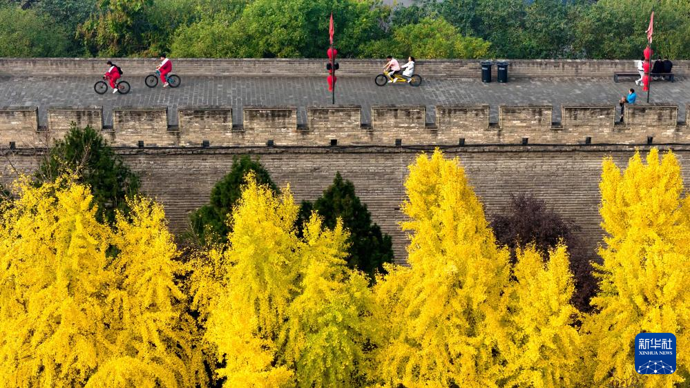 游客在西安城墙上骑行(无人机照片,11月10日摄)。