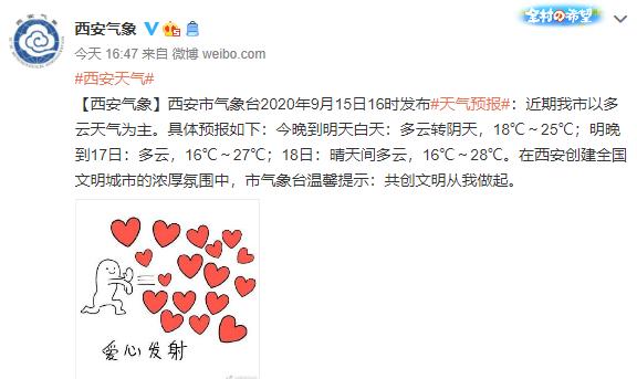 【西安气象】西安市气象台2020年9月15日16时发布天气预报:近期西安市以多云天气为主。