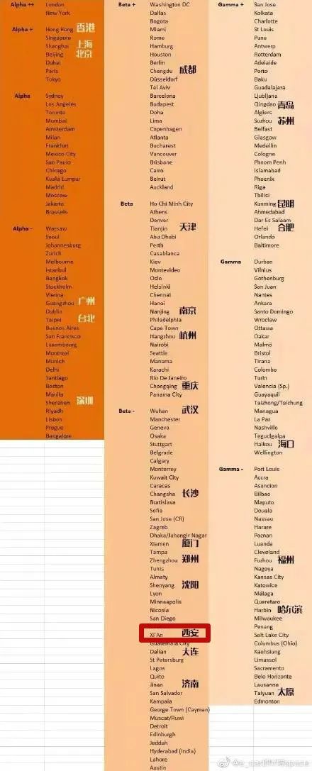 近日,由GaWC(“全球化和世界城市”研究网络)编制的《世界城市名册2020》(GaWC2020)正式对外发布,我国共有27个城市入选该榜单,西安实现了跨级别跃迁:从Gamma+升至Beta-,升级为第二梯队世界城市。
