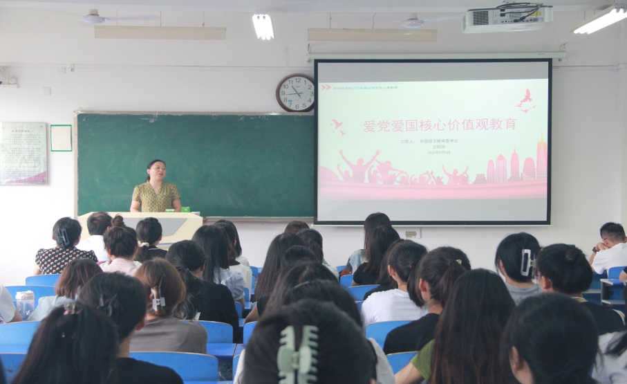 紧接着,官莉萍作了爱党爱国核心价值观教育报告,强调爱国主义教育是高校思想政治教育的重要内容,爱国主义的本质是坚持爱国和爱党、爱社会主义高度统一。