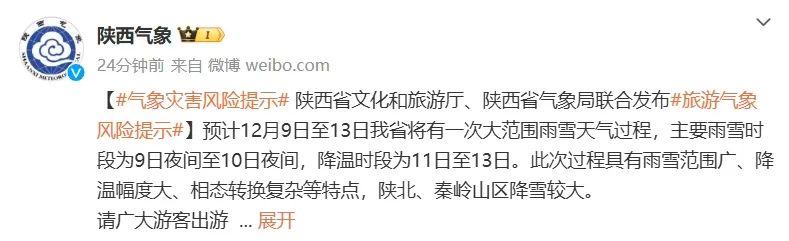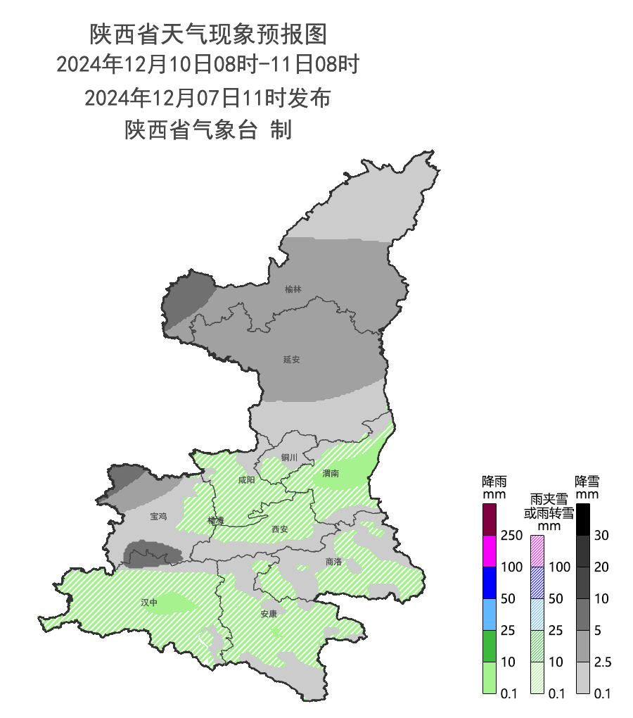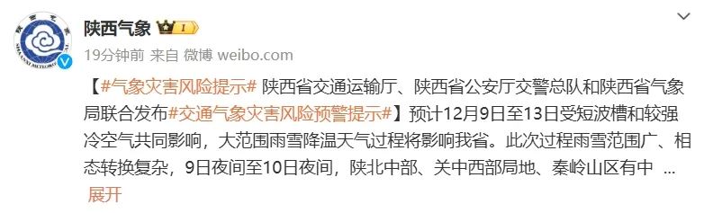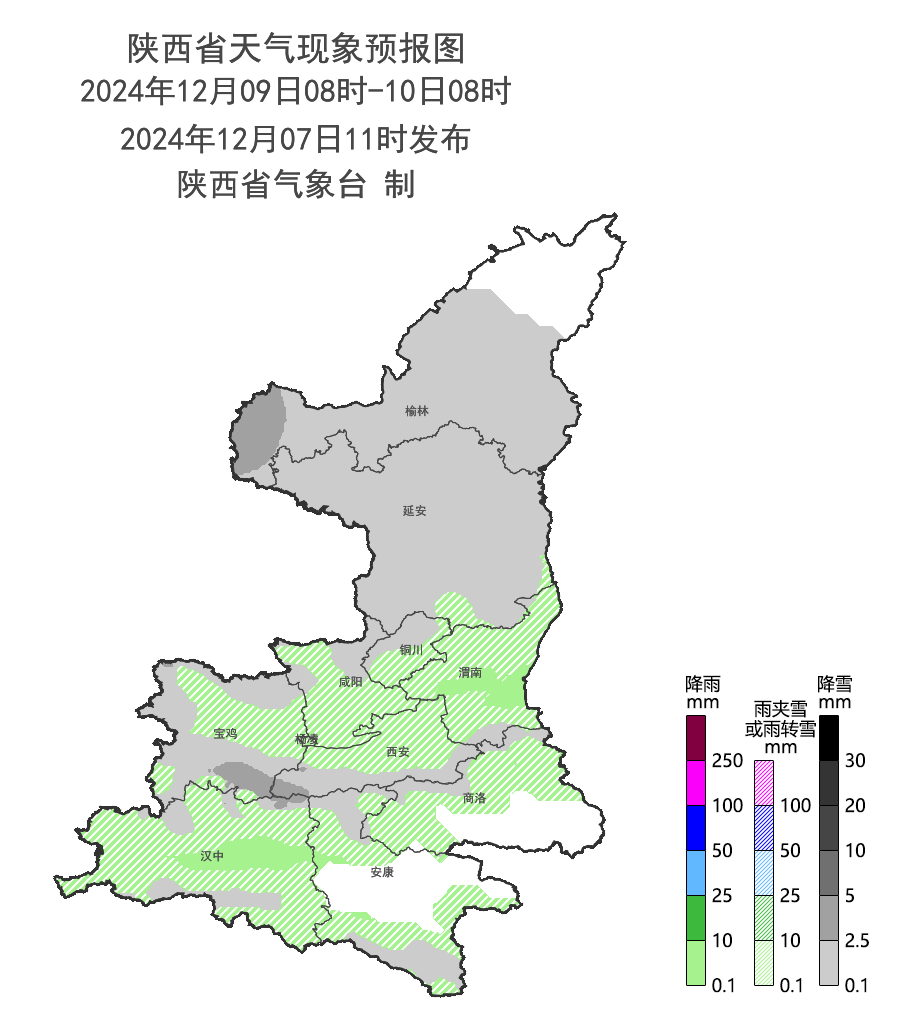 预计12月9日至13日我省将有一次大范围雨雪天气过程,主要雨雪时段为9日夜间至10日夜间,降温时段为11日至13日。此次过程具有雨雪范围广、降温幅度大、相态转换复杂等特点,陕北、秦岭山区降雪较大。