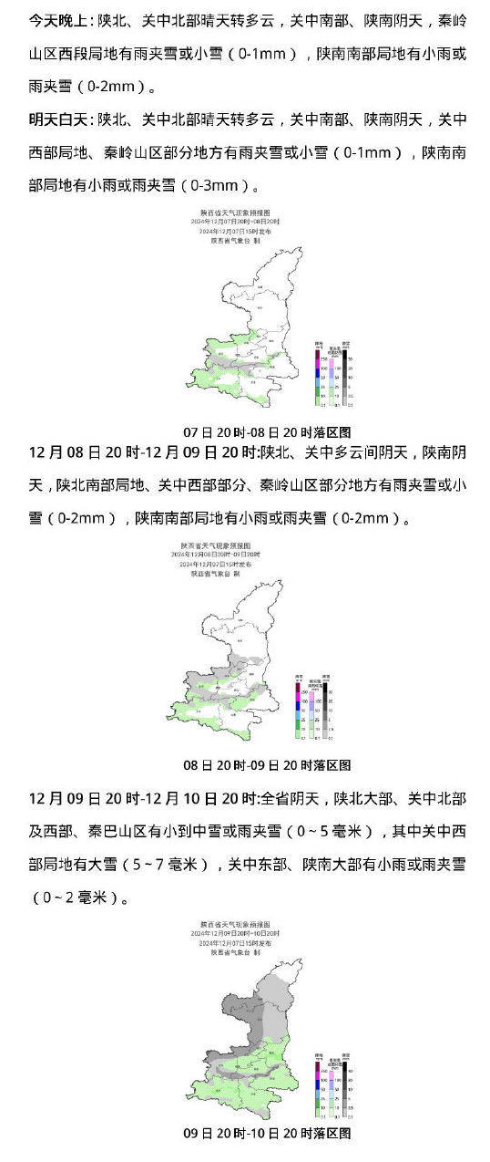 降水:9日阴天转小雨,南部地区有雨夹雪或小雪(0~2毫米)。10日阴天有小雨或雨夹雪(0~2毫米),南部山区有小到中雪(0.5~3.0毫米)。12日小雨或雨夹雪转阴天(0~1毫米),南部山区有小雪(0.5~2毫米)。秦岭山区积雪深度3-8厘米。