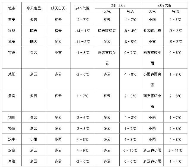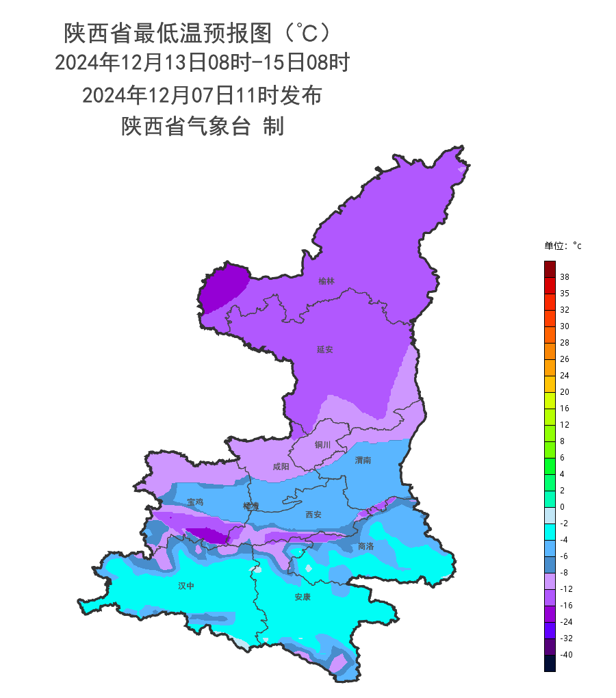 预计最低气温陕北出现在13日清晨,关中、陕南出现在14日清晨:陕北西部局地、秦岭山区西段-17~-15℃,陕北大部、秦岭山区东段-14~-12℃,关中北部-10~-8℃,关中南部、商洛-7~-4℃,汉中、安康-4~-2℃。