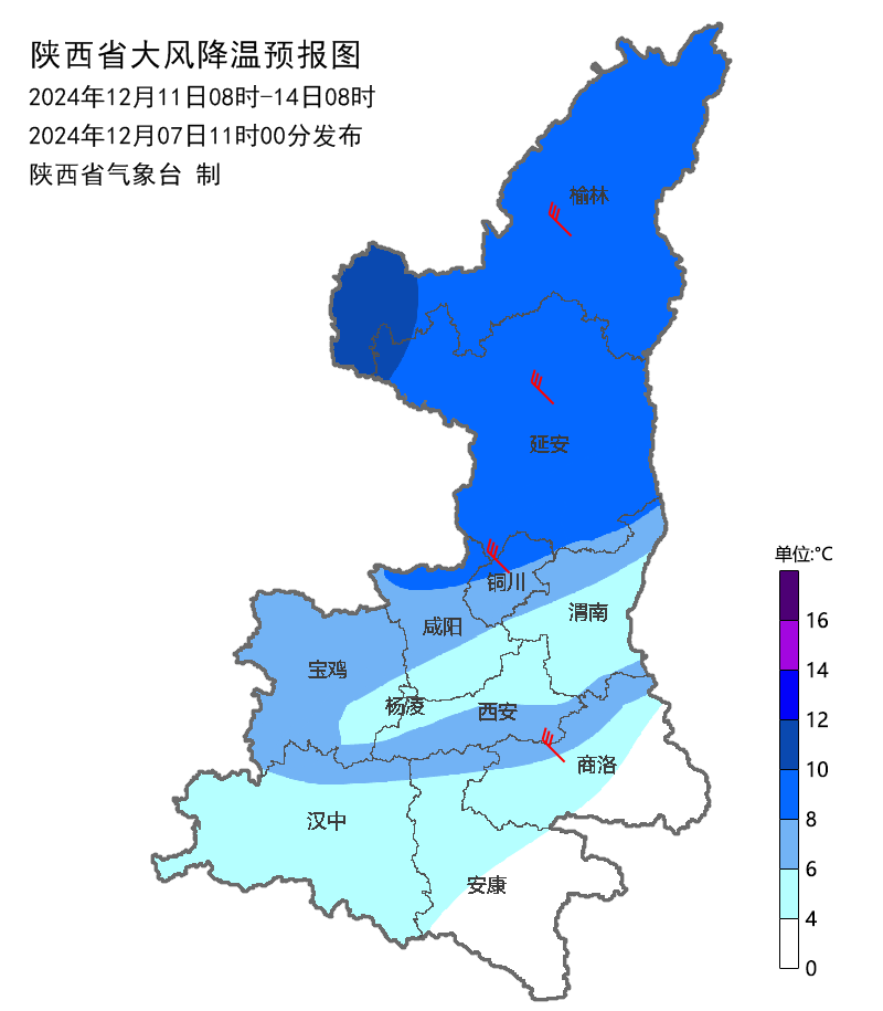 降温预报:11-13日过程日平均气温陕北下降8~10℃,关中北部及西部、秦岭山区下降6~8℃,关中东部、陕南西部下降4~6℃。