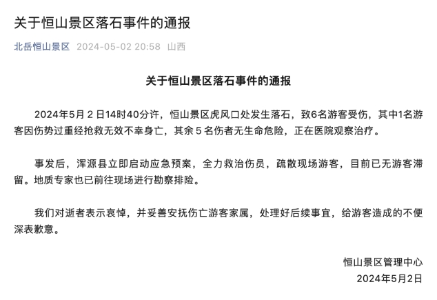 通报称,2024年5月2日14时40分许,恒山景区虎风口处发生落石,致6名游客受伤,其中1名游客因伤势过重经抢救无效不幸身亡,其余5名伤者无生命危险,正在医院观察治疗。