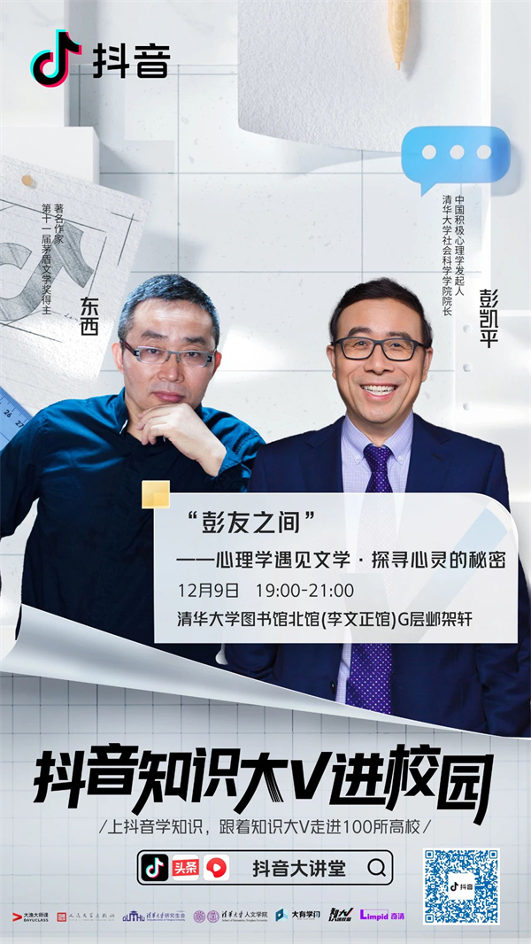 12月9日,著名作家、第十一届茅盾文学奖得主东西将做客清华大学,与中国积极心理学发起人、清华大学社会科学学院院长彭凯平一起带领读者们探寻心灵的秘密,分享茅奖作品的创作故事,与大家共度精彩的文学之夜。