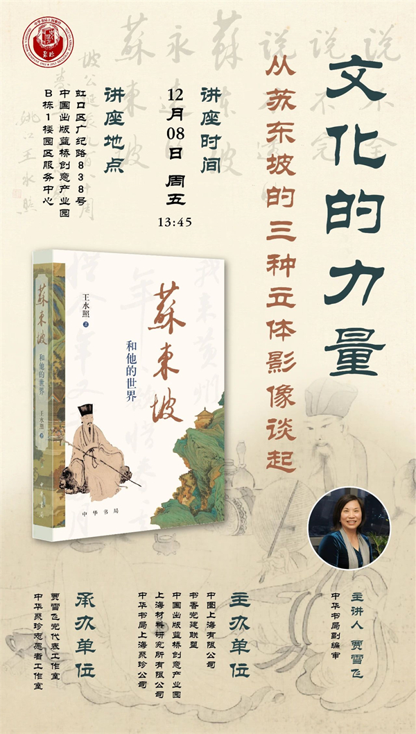 被称为“千古第一文人”的苏东坡是一位个性鲜明独特而又难于言说的人物,给中国文化史留下了丰富复杂而世所罕见的文化遗产。在众多轶事和传说背后,真实的苏东坡到底是怎样的?周五下午,我们邀请到中华书局上海聚珍文化传媒有限公司副总经理、副编审贾雪飞老师,为大家带来一场“文化的力量:从苏东坡的三种立体影像谈起”的主题分享。
