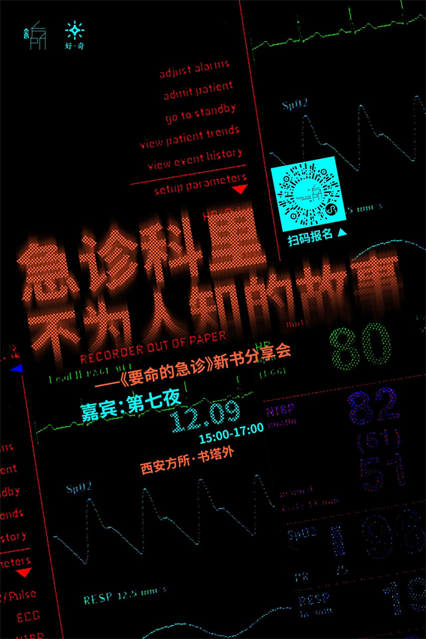 《要命的急诊》生动讲述了患者在生命与金钱当中、医生在理想与现实当中的两难抉择,令人唏嘘不已,并对当下的医疗体制与社会现实发出了沉重叩问。普通人最真实的生老病死,值得被更多人看见。周六下午,小说作者第七夜将做客方所,为读者讲述那些急诊科里不为人知的故事。