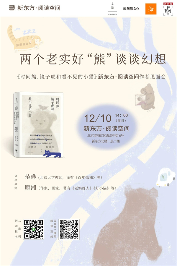 12月10日,《时间熊,镜子虎和看不见的小猫》作者范晔、绘者顾湘这两个好“熊”将在北京首度同台,做客新东方·阅读空间,聊聊“熊样”作者含熊量很高的作品,聊聊幻想,聊聊小动物,聊聊文学……与读者朋友们共赴一场孤独又温柔的幻想之旅。