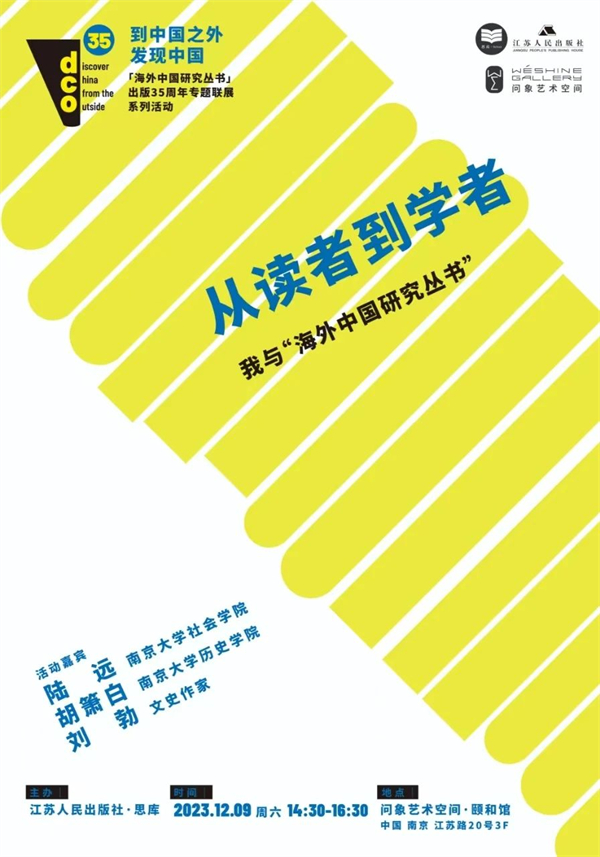 12月9日下午,南京大学社会学院副教授陆远、文史作家刘勃、南京大学历史学院副教授胡箫白将做客问象艺术空间(颐和馆),围绕“从读者到学者——我与‘海外中国研究丛书’”这一主题展开对谈。他们将基于其海外汉学阅读史、与海外汉学家的学术交流、海外视角对我们认识中国经验有何启示、海外汉学家的书写方式对我们有何借鉴意义等方面,进行一场深入浅出、别开生面的对话。